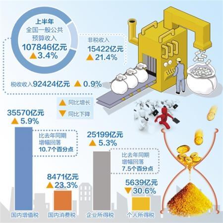上半年,全國一般公共預算收入107846億元,同比增長3.4%。其中,全國稅收收入92424億元,同比增長0.9%。