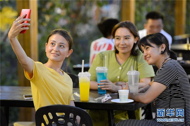7月19日,市民在吐魯番市長(zhǎng)沙·葡萄主題公園夜市拍照留念。