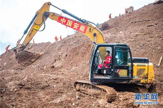 7月25日,救援人員在山體滑坡現(xiàn)場操作工程機(jī)械開展救援。新華社記者 陶亮 攝