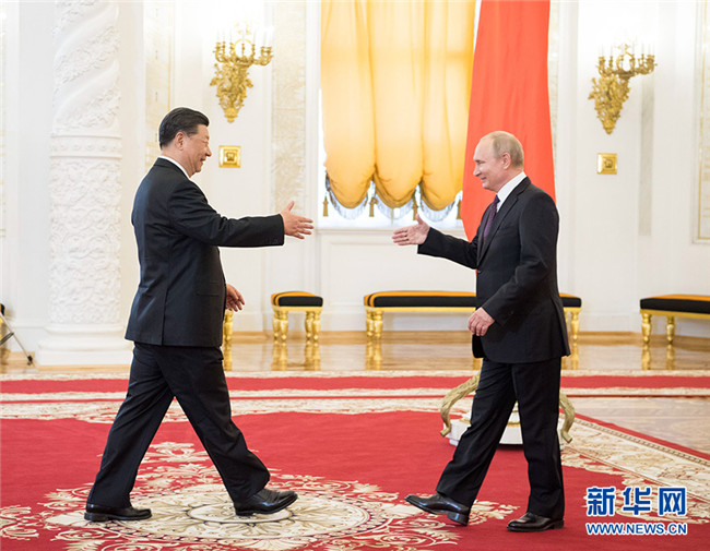 6月5日,國(guó)家主席習(xí)近平在莫斯科克里姆林宮同俄羅斯總統(tǒng)普京會(huì)談。這是兩國(guó)元首在會(huì)談前握手。 新華社記者 李學(xué)仁 攝