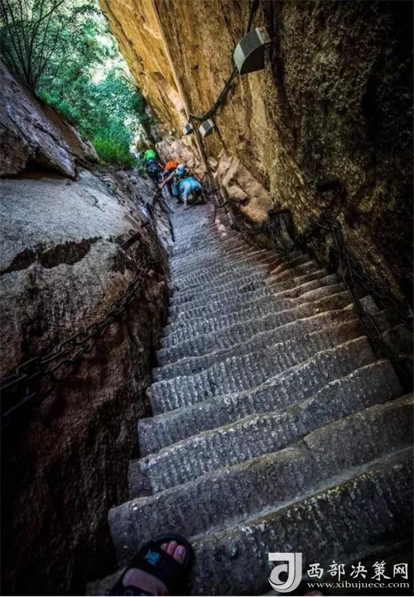 下去的路鑿在倒坎懸崖上,幾乎看不見(jiàn)路,需要用腳去試探,攀爬的困難程度甚至比長(zhǎng)空棧道更難,當(dāng)然可以看到的風(fēng)景也非常的獨(dú)到。