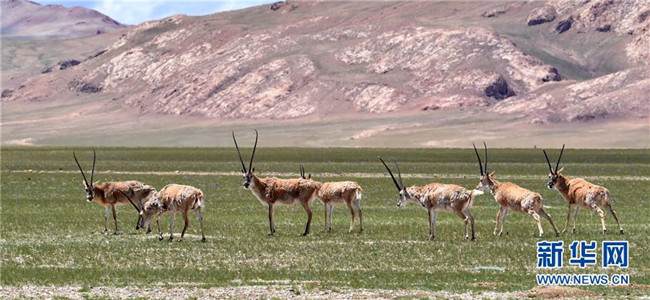 8月4日,藏羚羊在覓食。西藏那曲市尼瑪縣位于西藏西北部,位于羌塘國家級自然保護區(qū)內(nèi),是古老象雄文明的發(fā)祥地之一。這里空氣潔凈,野生動物繁多,深受游客喜愛。新華社記者覺果攝