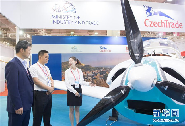 6月8日,在浙江寧波舉行的首屆中國-中東歐國家博覽會上,一名展商(右)在介紹捷克生產(chǎn)的一款輕型飛機(jī)。新華社記者 翁忻旸 攝