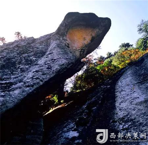 峰南側(cè)是千丈絕壁,直立如削,下臨一斷層深壑,同三公山、三鳳山隔絕。南峰由一峰二頂組成,東側(cè)一頂叫松檜峰,西側(cè)一頂叫落雁峰,也有說南峰由三頂組成,把落雁峰之西的孝子峰也算在其內(nèi)。這樣一來,落雁峰最高居中,松檜峰居?xùn)|,孝子峰居西,整體形象一把圈椅,三個峰頂恰似一尊面北而坐的巨人。