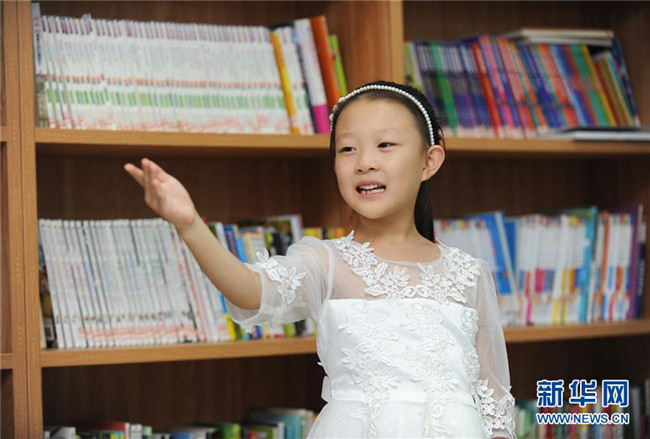 一名孩子在永清縣城區(qū)街道公益書(shū)屋內(nèi)誦讀經(jīng)典詩(shī)文(8月20日攝)。新華社記者 李曉果 攝