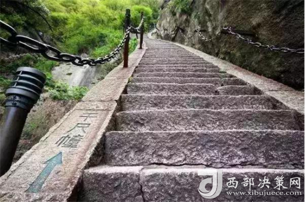千百年前,陡峭如削的華山,艱險異常,難以登攀,只能“望山興嘆”“遠(yuǎn)而望之”。后來人們循猿徑,依山就勢,巧妙地利用天設(shè)地造的石隙嶺脊,開鑿出了登山道路,始有天下奇觀“自古華山一條路”。