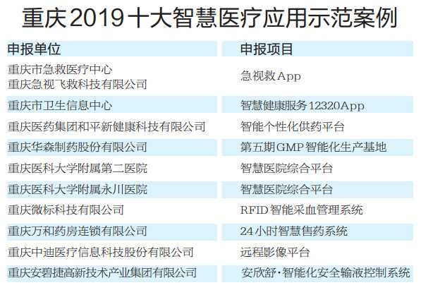 8月28日,在2019智博會上,重慶日報、上游新聞聯(lián)合發(fā)布了重慶2019十大智慧醫(yī)療應用示范案例,重慶市急救醫(yī)療中心、重慶市衛(wèi)生信息中心、重慶華森制藥等單位申報項目入選十大案例。