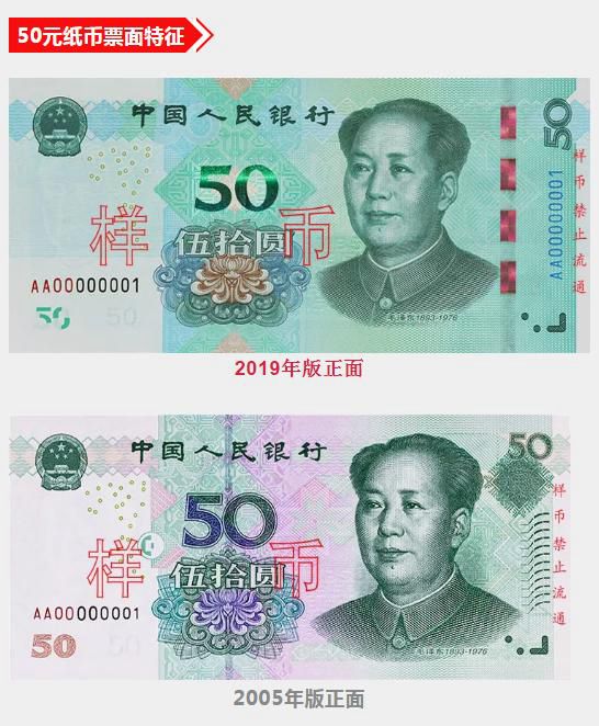 此外,2019年版第五套人民幣50元、20元、10元、1元紙幣調(diào)整正面毛澤東頭像、裝飾團(tuán)花、橫號(hào)碼、背面主景和正背面面額數(shù)字的樣式,增加正面左側(cè)裝飾紋樣,取消正面右側(cè)凹印手感線(xiàn)和背面右下角局部圖案,票面年號(hào)改為“2019年”。