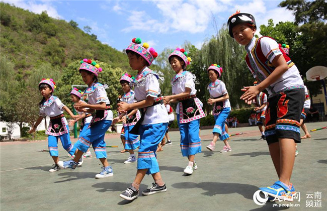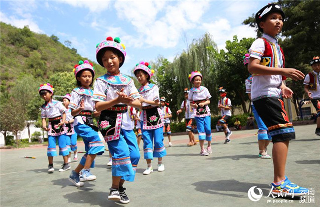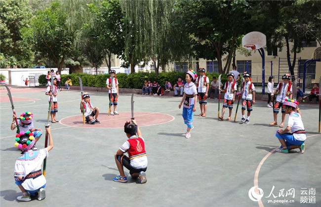 9月2日,云南省漾濞彝族自治縣雞街完小的學生在課間練習大刀舞。大刀舞是當?shù)匾妥迦罕娫陂L期的生產(chǎn)生活實踐中逐漸積累演化形成的一種彝族文化,經(jīng)過代代藝人們的不斷傳承與完善,于2013年被列為省級非物質(zhì)文化遺產(chǎn)項目保護名錄。近年來,漾濞縣不斷加大非物質(zhì)文化遺產(chǎn)保護力度,組織非遺傳承人走進校園,手把手教授孩子們學習大刀舞。(李發(fā)興)