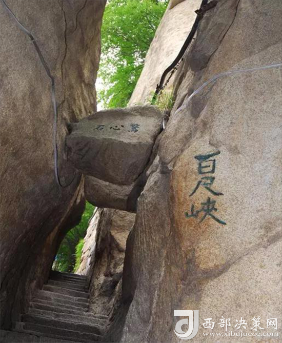 出千尺㠉不遠是百尺峽,這里是登山第二道險關。兩壁高聳,中間夾有一塊從天而降的巨石,上刻“驚心石”三個大字,游人要從石下小路穿過,確實驚心動魄。此后還有仙人橋、俯渭崖、黑虎嶺等小險處,就到了登山第三道險關老君犁溝,這是夾在陡峭石壁之間的一條溝狀險道,深不可測,有石階570有余。