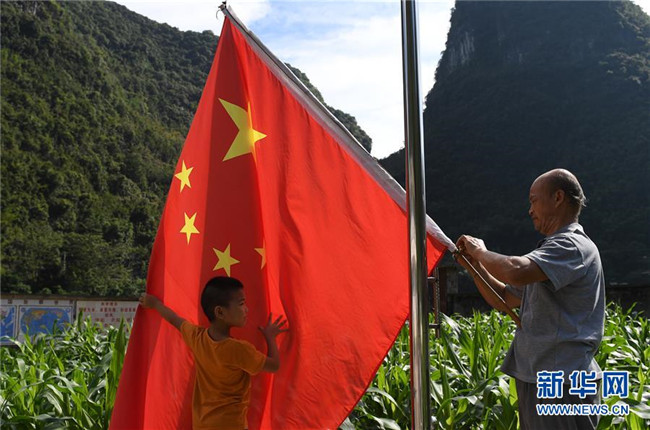 在廣西都安瑤族自治縣龍灣鄉(xiāng)琴棋小學(xué),黃若珍老師(右)和學(xué)生準(zhǔn)備升國旗(2017年8月31日攝)。新華社記者 陸波岸 攝