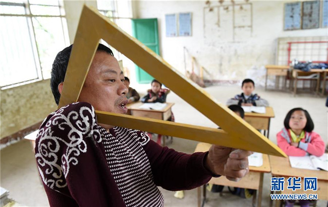 在廣西全州縣白寶鄉(xiāng)北山村小學(xué),唐廣芳老師用殘疾的右臂夾著三角板在給學(xué)生上課(2016年4月26日攝)。新華社記者 陸波岸 攝