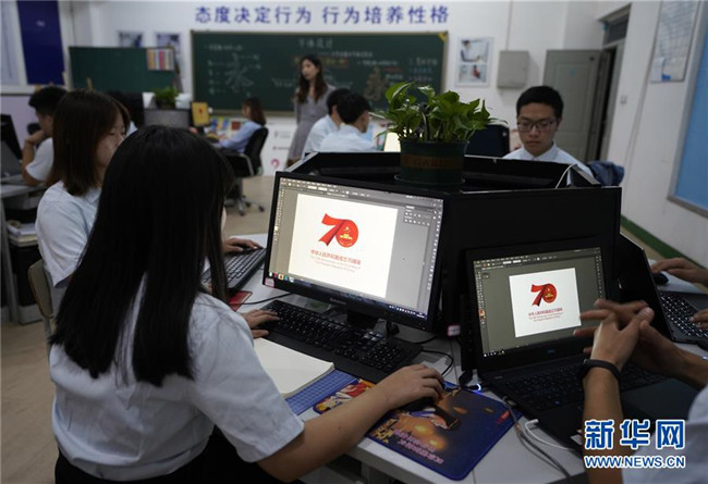 9月18日,邢臺技師學院的學生在平面設計課程上臨摹慶祝中華人民共和國成立70周年活動標識。