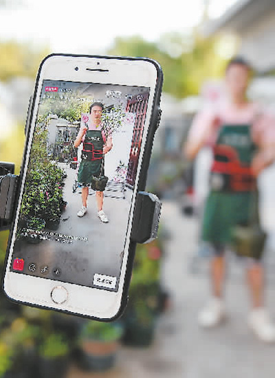 江蘇省宿遷市沭陽(yáng)縣,一名花農(nóng)正在家門(mén)口直播銷(xiāo)售月季花。 新華社記者 李 響攝