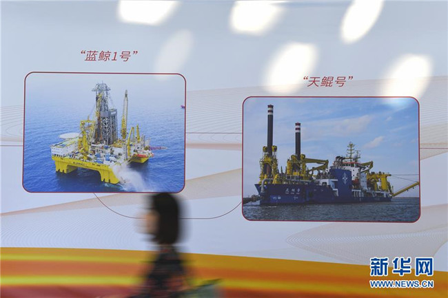 10月15日,與會者經過“藍鯨1號”鉆井平臺與“天鯤號”自航絞吸挖泥船展板。 新華社記者毛思倩攝