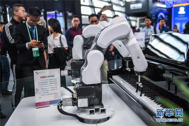 這是互聯(lián)網(wǎng)之光博覽會(huì)現(xiàn)場(chǎng)展示的能彈鋼琴的5G機(jī)器人(10月18日攝)。 新華社記者 徐昱 攝