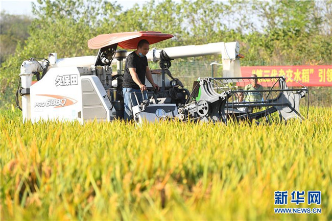 在第三代雜交水稻新組合試驗示范衡南基地一塊被抽取測產(chǎn)的示范田里,工作人員進(jìn)行機(jī)械化收割測產(chǎn)(10月21日攝)。 新華社記者 陳澤國 攝