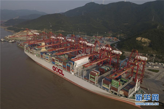 一艘貨輪停靠在寧波舟山港穿山港區(qū)集裝箱碼頭(2018年6月13日無(wú)人機(jī)拍攝)。新華社記者 黃宗治 攝