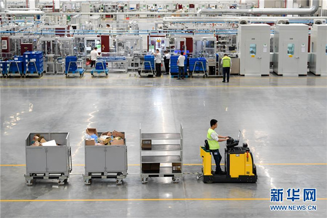 江蘇太倉(cāng)博澤汽車(chē)部件有限公司工作人員在生產(chǎn)車(chē)間運(yùn)輸產(chǎn)品(10月30日攝)。新華社記者 李博 攝