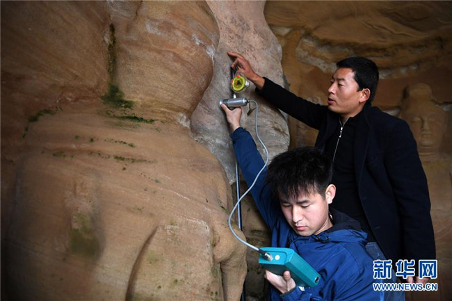 11月5日,在甘肅省慶陽市北石窟寺267窟,敦煌研究院北石窟寺文物保護(hù)研究所工作人員在檢測記錄巖體含水率。 新華社記者 馬寧 攝