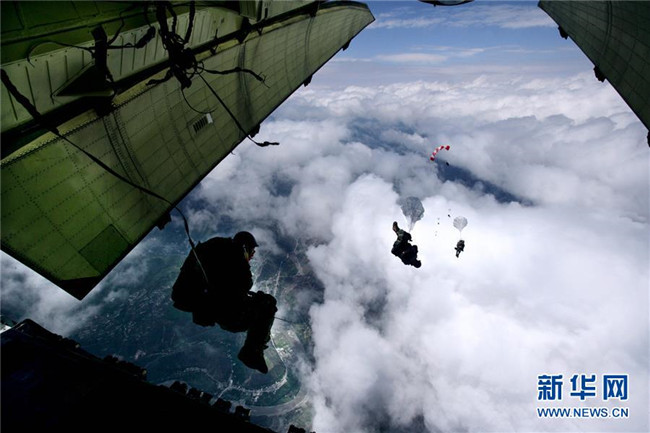 2008年5月14日,15名空降兵從地震災(zāi)區(qū)四川茂縣上空4999米的高空奮不顧身跳下,進(jìn)入道路阻斷的災(zāi)區(qū)參加救援。新華社發(fā)(劉應(yīng)華 攝)