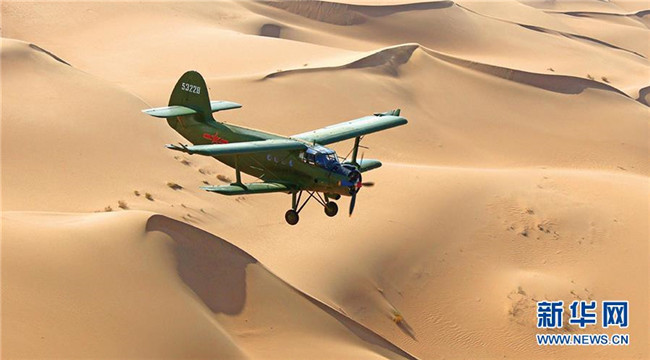 2018年,空軍運-5飛機(jī)在沙漠上空進(jìn)行飛播造林作業(yè)。 新華社發(fā)(席博博 攝)