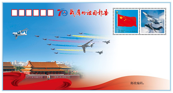 《戰(zhàn)鷹向祖國(guó)報(bào)告》紀(jì)念封之一。 10月18日,慶祝人民空軍成立70周年航空開(kāi)放活動(dòng)迎來(lái)首個(gè)公眾日,空軍在活動(dòng)現(xiàn)場(chǎng)發(fā)布一套兩枚強(qiáng)軍主題紀(jì)念封《戰(zhàn)鷹向祖國(guó)報(bào)告》,展現(xiàn)空軍殲-20、運(yùn)-20、轟-6N等新型戰(zhàn)機(jī)的藍(lán)天英姿。