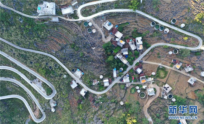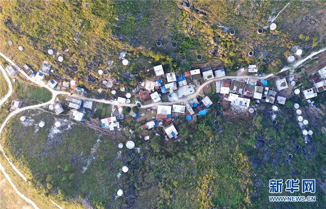 廣西大化瑤族自治縣七百弄鄉(xiāng)弄騰村群眾的家庭水柜分布在房前屋后(11月9日無(wú)人機(jī)拍攝)。 新華社記者 黃孝邦 攝