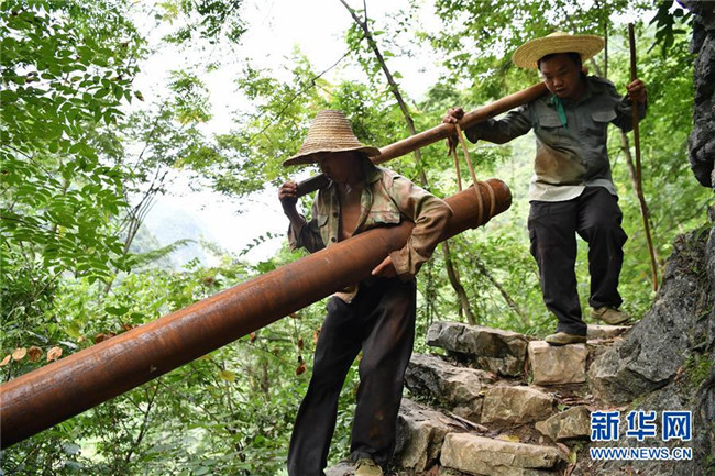 在廣西大化瑤族自治縣板升鄉(xiāng)弄雷村,工人們抬著抗旱飲水工程的水管在山路上前行(2016年8月10日攝)。 新華社記者 黃孝邦 攝