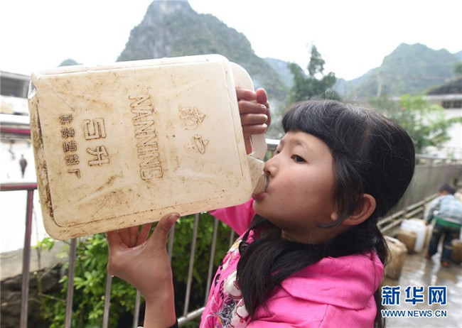 在廣西大化瑤族自治縣板升鄉(xiāng)八好小學(xué),一名學(xué)生喝水桶里的雨水(2014年11月24日攝)。八好小學(xué)有400多名學(xué)生,曾僅有一個(gè)不足100立方米的水柜,用于收集儲(chǔ)存樓頂?shù)挠晁?,學(xué)生需定期定量用水。遇到長(zhǎng)時(shí)間不下雨,學(xué)校需要到鄉(xiāng)政府所在地運(yùn)水。如今,學(xué)校修建了5個(gè)大水柜,并從兩公里外引泉水到校園,飲水難問(wèn)題得到解決。 新華社記者 黃孝邦 攝
