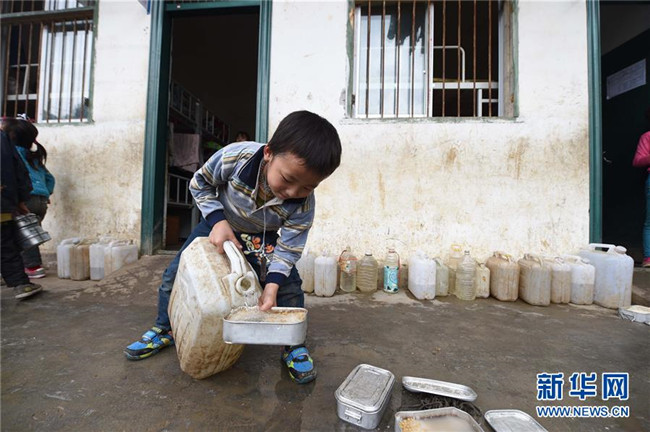 在廣西大化瑤族自治縣板升鄉(xiāng)八好小學(xué),一名學(xué)生用儲(chǔ)備在水桶里的雨水淘米煮飯(2014年11月24日攝)。八好小學(xué)有400多名學(xué)生,曾僅有一個(gè)不足100立方米的水柜,用于收集儲(chǔ)存樓頂?shù)挠晁?,學(xué)生需定期定量用水。遇到長(zhǎng)時(shí)間不下雨,學(xué)校需要到鄉(xiāng)政府所在地運(yùn)水。如今,學(xué)校修建了5個(gè)大水柜,并從兩公里外引泉水到校園,“飲水難”問(wèn)題得到解決。 新華社記者 黃孝邦 攝
