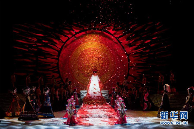 演員在音樂(lè)舞劇《云繡彝裳》第四章節(jié)“紅妝似火”中表演(11月15日攝)。新華社記者胡超攝