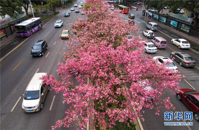 這是美麗異木棉花競相綻放的廣西柳州市東環(huán)大道(12月1日無人機拍攝)。 新華社記者 黃孝邦 攝