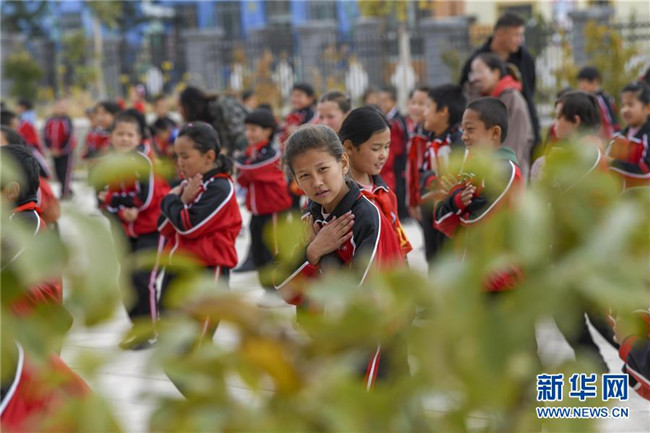 在哈密幸福村小學里,孩子們在做課間操(10月22日攝)。新華社記者 趙戈 攝