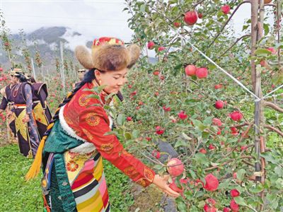 在四川省農(nóng)科院的專家?guī)头鱿?,林巴村建立起了一座現(xiàn)代蘋果種植標(biāo)準(zhǔn)化示范園,如今果園里的蘋果已經(jīng)掛果成熟。
