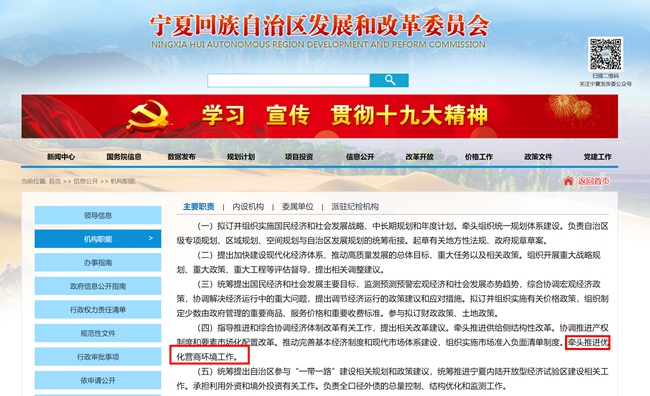 在自治區(qū)發(fā)改委官方網站上,其機構職能中主要職責提到負責牽頭推進優(yōu)化營商環(huán)境工作。(網頁截圖)