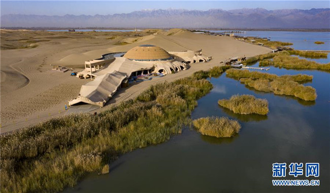 位于寧夏石嘴山市平羅縣境內(nèi)的沙湖景區(qū),依沙傍水呈現(xiàn)出獨(dú)特的魅力(10月30日無(wú)人機(jī)拍攝)。 新華社記者 馮開華 攝