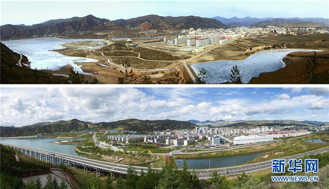 拼版照片:上圖為2009年1月30日拍攝的寧夏固原市隆德縣境內(nèi)的渝河景象;下圖為經(jīng)過(guò)流域綜合治理后的渝河(2018年5月19日攝)。 新華社發(fā)(李玉 攝)