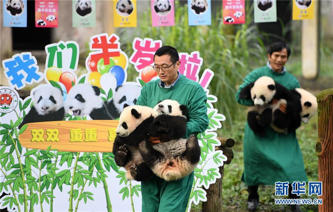 12月22日,重慶動物園4只半歲大熊貓在戶外活動。當(dāng)日,重慶動物園為4只大熊貓寶寶“雙雙”“重重”“喜喜”“慶慶”舉行半歲生日慶?;顒印?只半歲大熊貓在飼養(yǎng)員的照料下,在熊貓館運動場內(nèi)玩耍、嬉戲,與市民游客一同過冬至。新華社記者唐奕攝