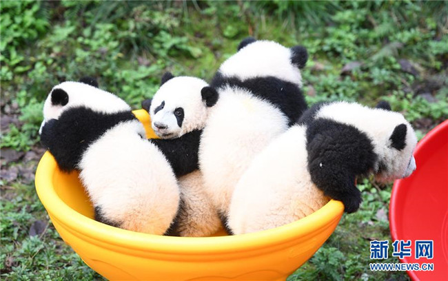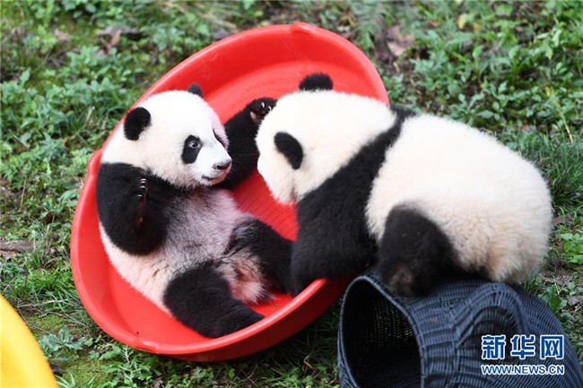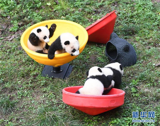 12月22日,重慶動物園4只半歲大熊貓在玩耍。當(dāng)日,重慶動物園為4只大熊貓寶寶“雙雙”“重重”“喜喜”“慶慶”舉行半歲生日慶?;顒?。4只半歲大熊貓在飼養(yǎng)員的照料下,在熊貓館運動場內(nèi)玩耍、嬉戲,與市民游客一同過冬至。新華社記者唐奕攝