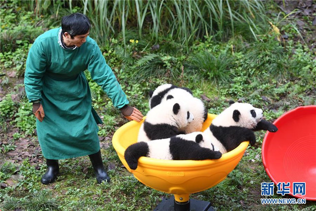 12月22日,飼養(yǎng)員引導(dǎo)大熊貓寶寶到戶外運動。當(dāng)日,重慶動物園為4只大熊貓寶寶“雙雙”“重重”“喜喜”“慶慶”舉行半歲生日慶祝活動。4只半歲大熊貓在飼養(yǎng)員的照料下,在熊貓館運動場內(nèi)玩耍、嬉戲,與市民游客一同過冬至。新華社記者唐奕攝