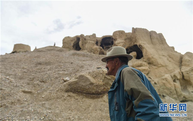 76歲的達(dá)瓦次仁走過(guò)古格遺址前的洞窟,這里曾是他的家(7月30日攝)。 新華社記者 晉美多吉 攝
