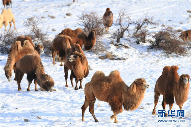 12月30日,一群駱駝在新疆吉木乃縣“萬駝園”覓食。新華社記者 沙達提 攝