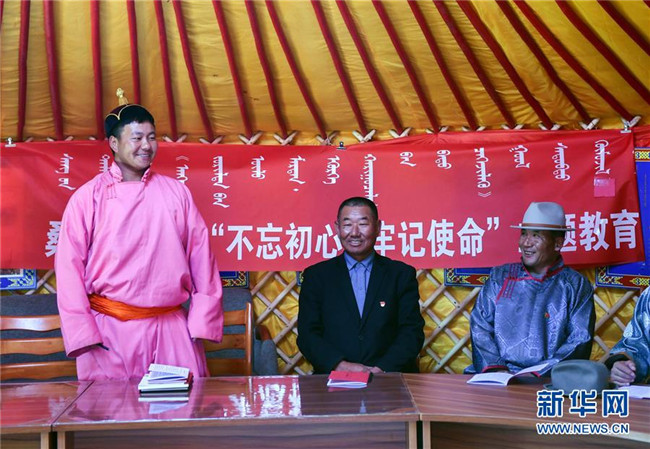 2019年10月11日,在內(nèi)蒙古自治區(qū)正藍(lán)旗恩克寶力格嘎查黨員中心戶的蒙古包中,黨員敖日格勒(左一)在回答知識(shí)競(jìng)賽問(wèn)題。新華社記者 劉磊 攝