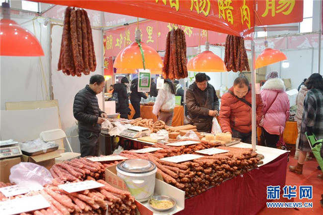 1月8日,消費者在內蒙古國際會展中心挑選香腸等年貨。新華社記者 王靖 攝