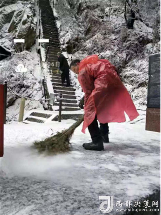 清晨天未亮?xí)r,主峰區(qū)全體人員冒著嚴(yán)寒降雪已經(jīng)投入到清掃積雪的工作中。