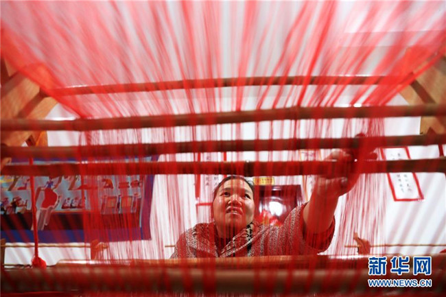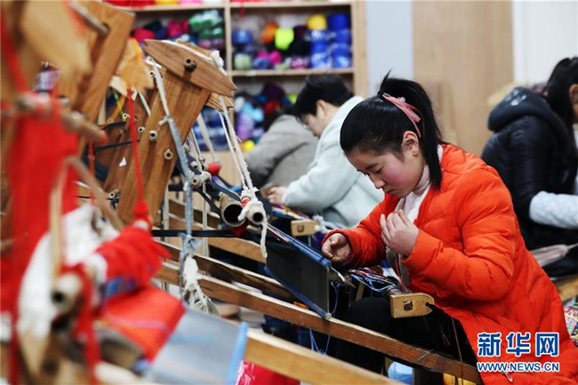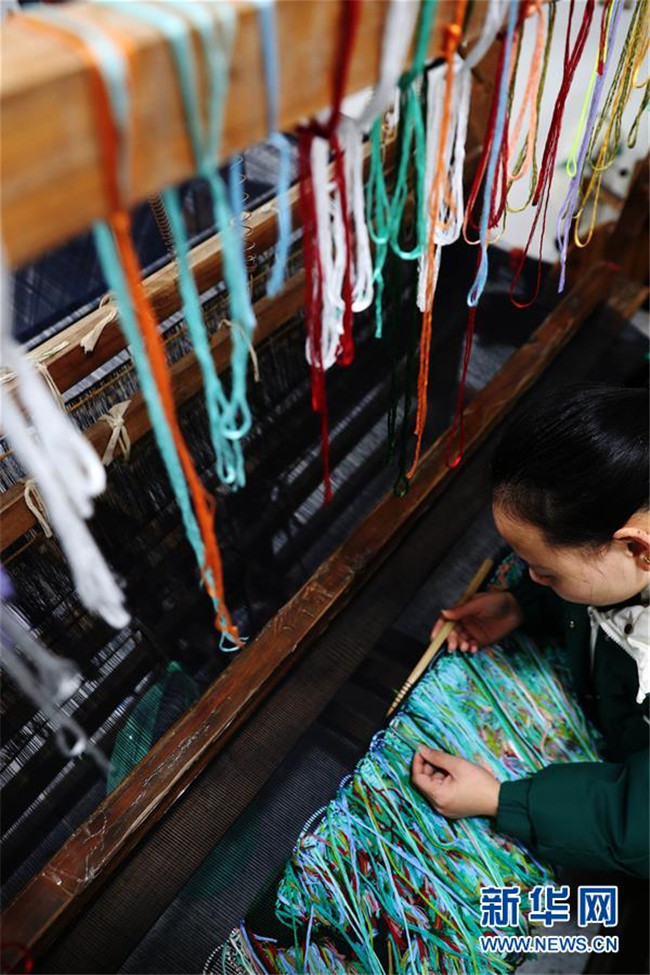 1月14日,在重慶市黔江區(qū)小南海鎮(zhèn)土家十三寨“西蘭卡普扶貧工坊”,員工在編織西蘭卡普。  新華社發(fā)(楊敏 攝)