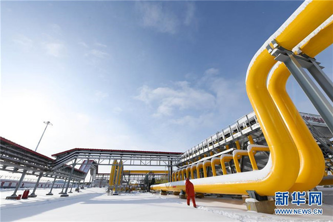在中俄東線天然氣管道北段黑河首站場區(qū),工作人員從管線旁經(jīng)過(2019年11月19日攝)。 新華社記者 王建威 攝
