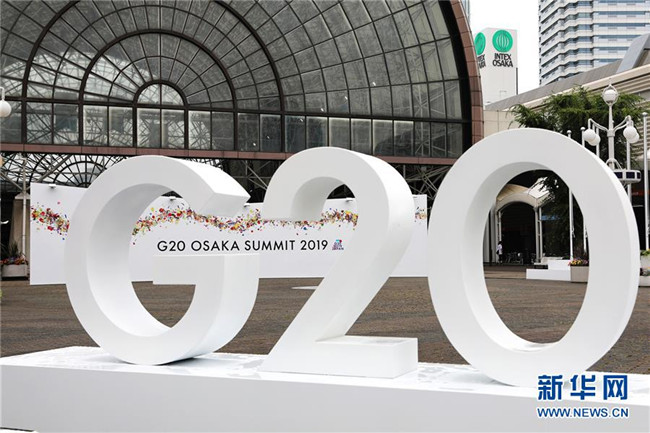 這是2019年6月27日在日本大阪拍攝的G20大阪峰會新聞中心入口處的標志。 新華社記者 杜瀟逸 攝