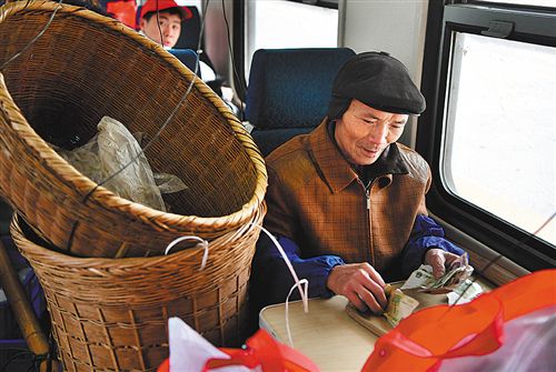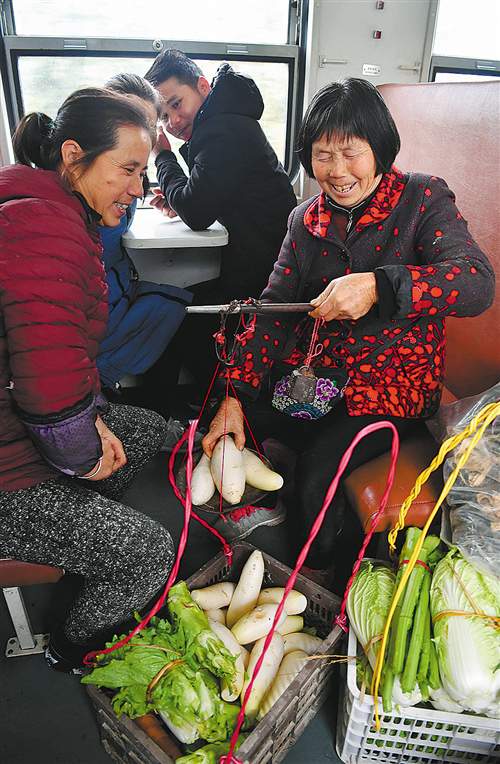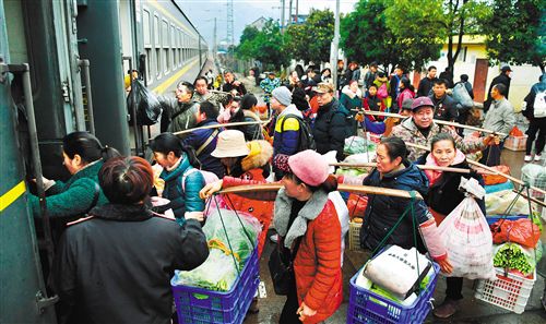 ▲??吭诤鲜÷殛柟赫镜?272次列車,當(dāng)?shù)毓r(nóng)菜農(nóng)挑著擔(dān)子準(zhǔn)備上車。這趟“慢火車”所經(jīng)過的地區(qū)多為“老少邊窮”,經(jīng)濟(jì)欠發(fā)達(dá)。為盤活沿途百姓致富渠道,鐵路部門開“綠燈”允許乘客攜帶大量鮮活貨物乘車。